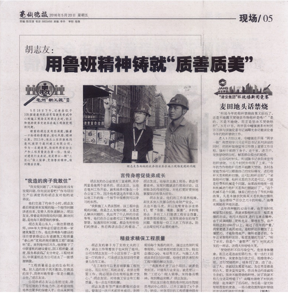 眼前的胡志友有些消瘦,操著一口標準的普通話,談吐風雅、眼神認真。2013年,他從山東濟南來到亳州,就職于亳州建工有限公司。作為一名建造師,他始終將安全生產(chǎn)和工程質量放在第一位。他說,對建筑行業(yè)來說,就是要以一顆“工匠心”做人做事,發(fā)揚魯班精神,做到精益求精。