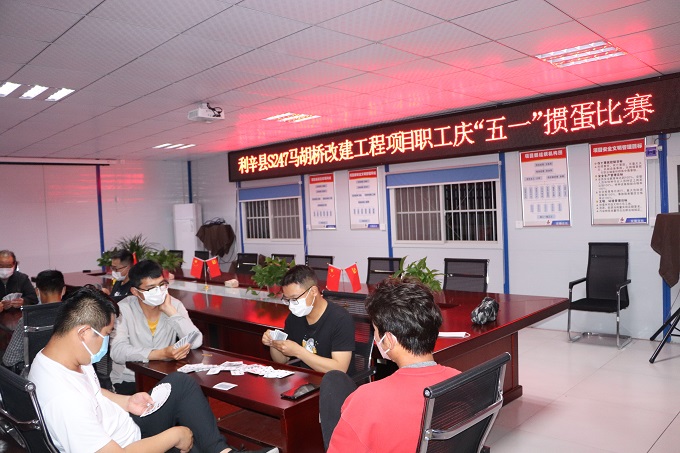 在5月1日當(dāng)天晚上,利辛縣S247馬胡橋改建工程項目部利用晚餐后時間,積極組織全體員工在項目會議室舉辦摜蛋比賽,本著“公平、公開、公正”的原則,員工自由組隊通過抽簽決定對手。比賽中,選手組員之間密切配合,相互切磋牌技,歡聲笑語此起彼伏,經(jīng)過多輪次比拼,最終選拔出一等獎一組、二等獎一組、三等獎一組,最后項目經(jīng)理為一二三等獎獲得者頒發(fā)了獎品。